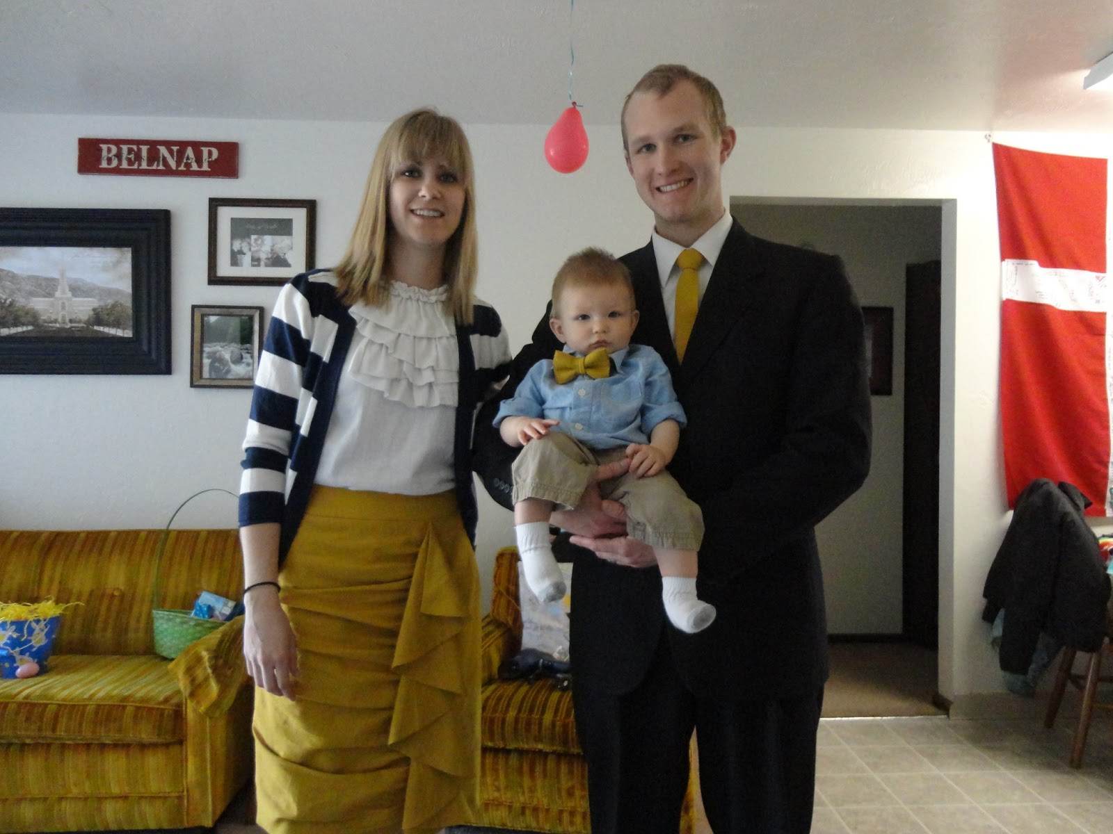 We had a really fun Easter! Eli is a really fun age right now. Where He starting to be able to do more but still needs/wants our help. Last Saturday our apartment complex had an Easter egg hunt. Eli would pick up the eggs and shake them and look around wonder what everyone was doing. It was really funny and the weather was gorgeous. On Sunday the Easter bunny left a trail of Easter eggs from his room to his basket. He would crawl to one egg and shake it or eat it then see the next egg and crawl to it and play with it all the way til he got to his Easter basket. I was so excited the egg trail worked! He got a toy and some books, bubbles and a church movie. It was really fun! The Easter bunny surprised Devin with Jurassic Park 3D movie tickets which is his favorite movie and he loves dinosaurs! I made a Easter skirt and a matching bow tie for Eli and a matching skinny tie for Devin. We had a very nice Easter Sunday and I'm so thankful for this day we can reflect on the great example our Savior is and what he's done for us.